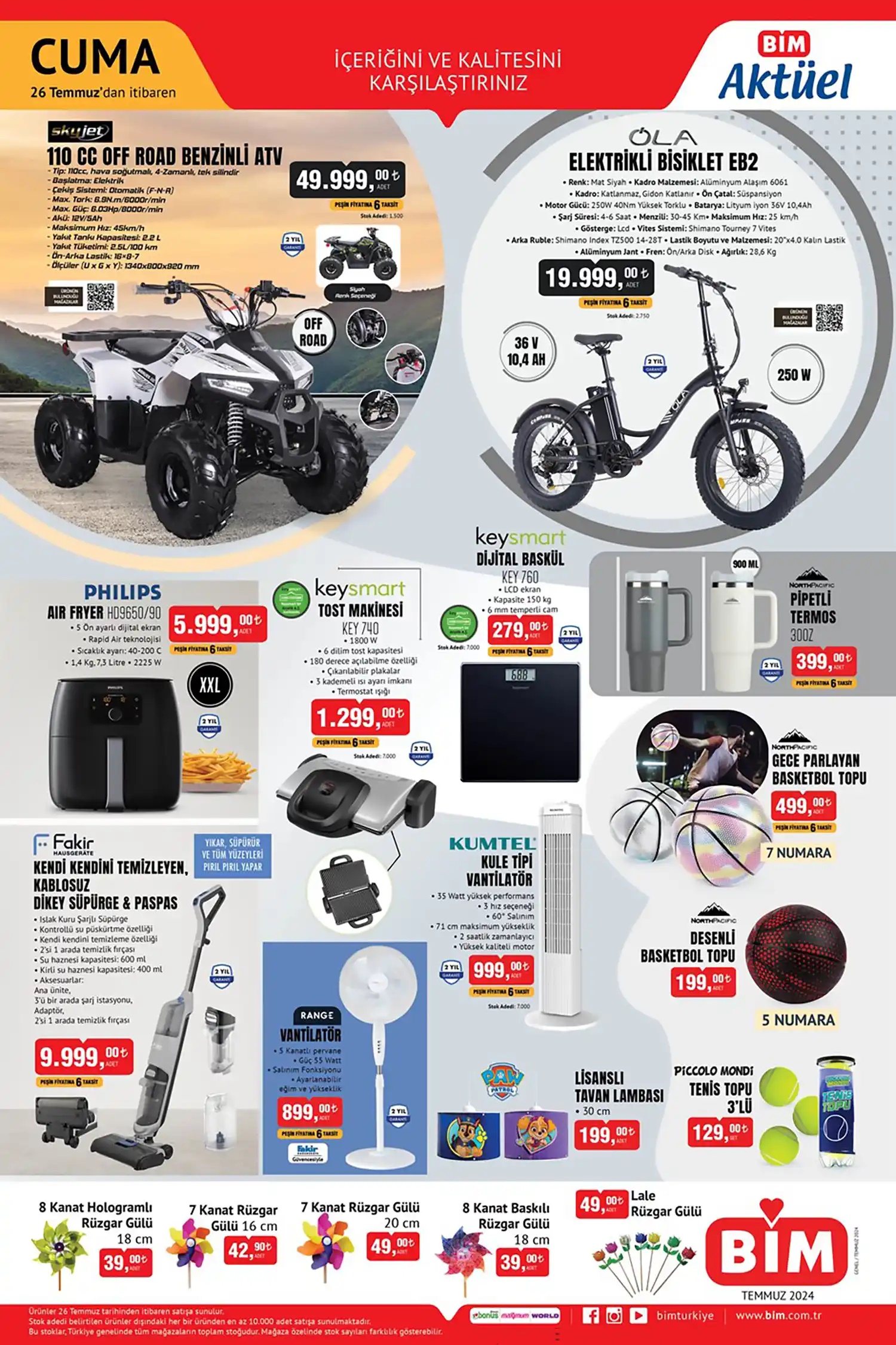 BİM de bu hafta; Off Road benzinli ATV 49.999 TL, 36V ve 10,4Ah özellikleriyle Elektrikli Bisiklet 19.999 TL. Yine Philips Air Fryer 5.999 TL, KeySmart tost makinesi 1299 TL, Dijital baskül 79 TL, Pipetli Tormos 39 9TL, Fakir kendi kendini temizleyen kablosuz dikey süpürge & paspas ürünü 9.999 TL, Range vantilatör 899 TL.