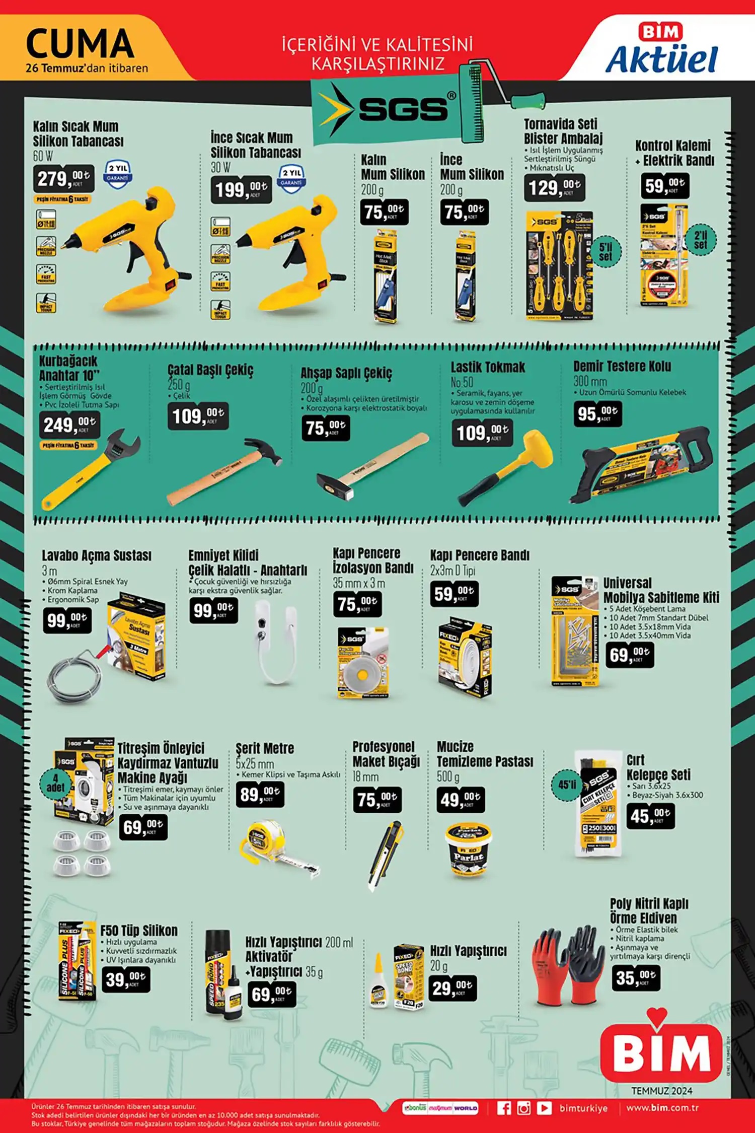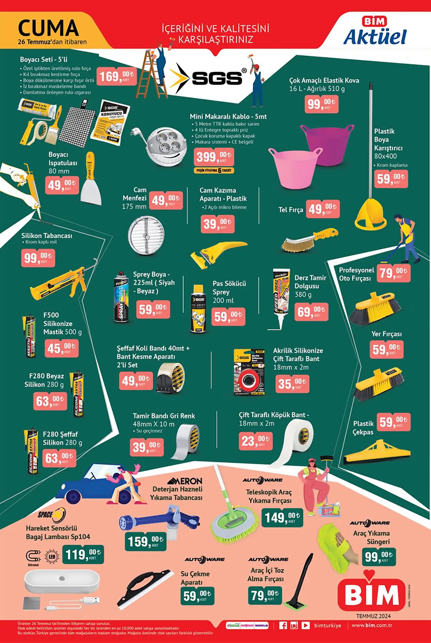 Çatal başlı çekiç 109 TL, ahşap saplı çekiç 75 TL, Lastik tokmak için 109 TL, demir testere kutusu 95 TL, lavabo açma sustasında 99 TL, emniyet kilidi çelik halatlı – anahtarlı ürününde 99 TL, kapı pencere bandında 59 TL, Silikon tabancası 99 TL, sprey boyada 59 TL fiyat sunuyor. Derz tamir dolgusunu 69 TL, profesyonel oto fırçası 79 TL, hareket sensörlü bagaj lambası için 119 TL , deterjan hazneli yıkama tabancası 159 TL Araç yıkama süngerin 9 TL, araç içi toz alma fırçası 79 TL.