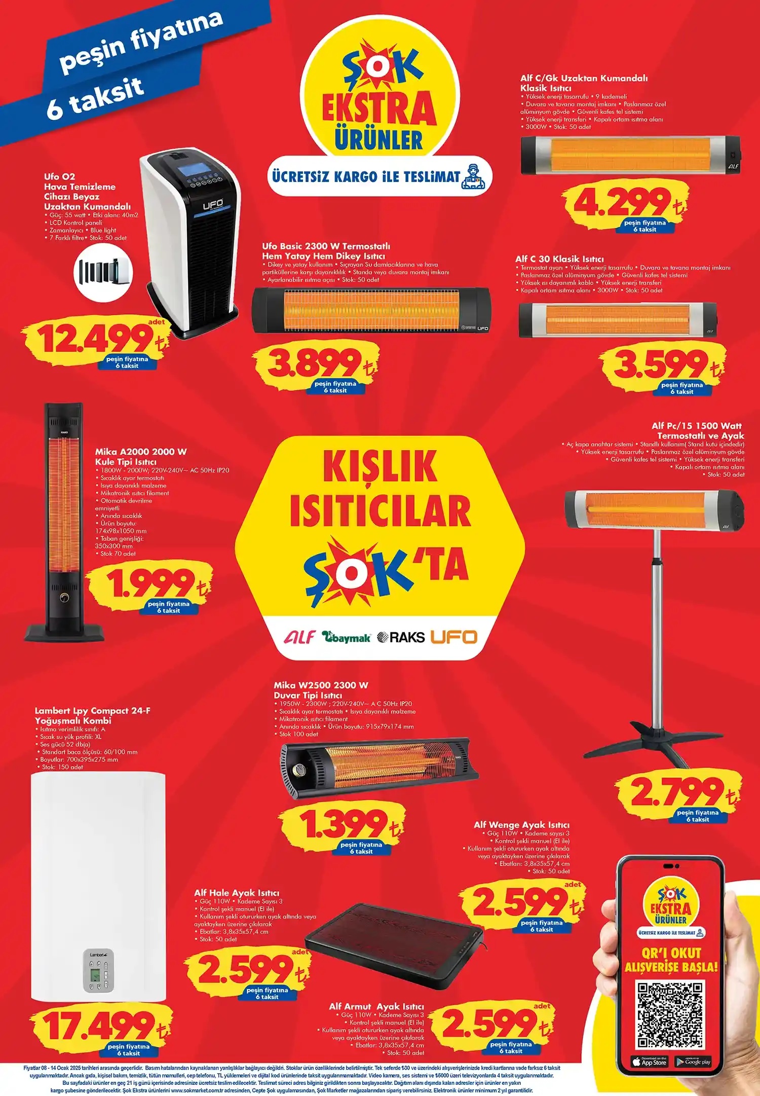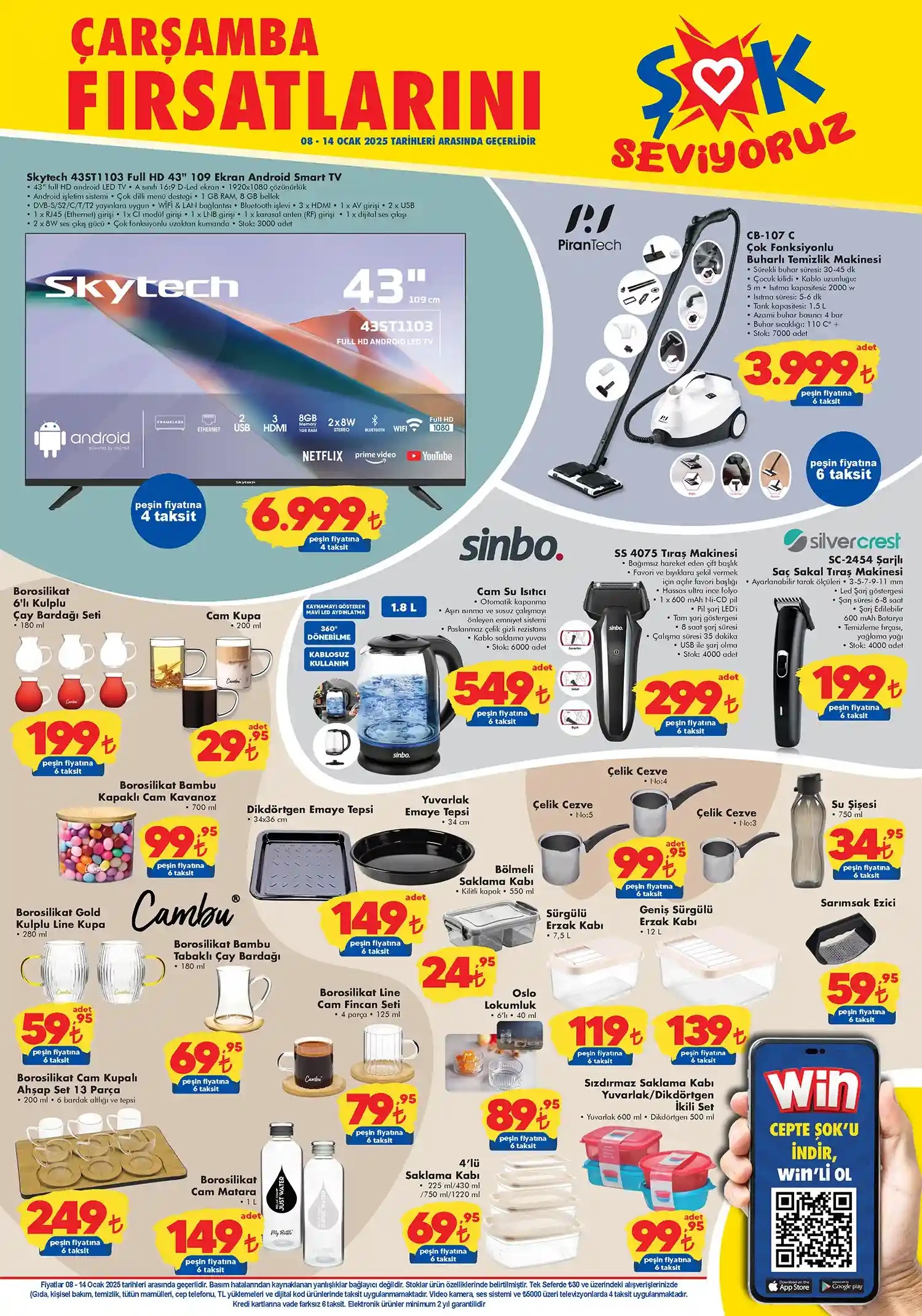 İndirimin devamında Pirantech CB-107C çok fonksiyonlu buharlı temizlik makinesi geliyor. 7.000 adet stokla sınırlı olan 3.999TL den satışa sunulan üründe peşin fiyatına 6 taksit avantajı bulunuyor. Yine 8 Ocak 2025 Çarşamba günü marketlerde Sinbo cam su ısıtıcı 1,8 lt ürünü için 549 TL, raş makinesi için 299 TL, saç sakal tıraş makinesi şarjlı ürünü için ise 199 TL olup market reyonlarında müşterilerini bekleyecek.
