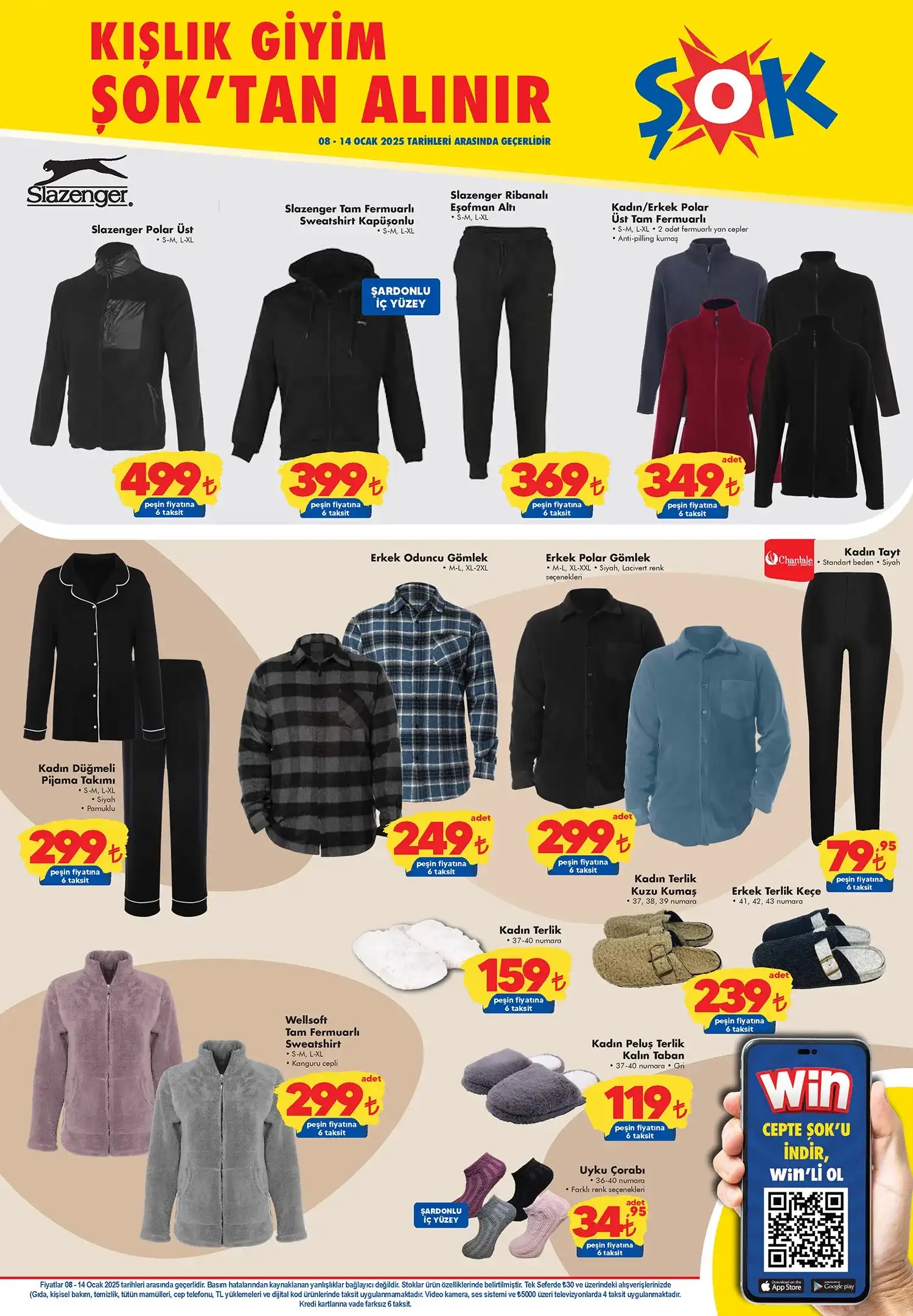 ŞOK da bu hafta Slazenger polar üst 499,00 TL, kapşonlu ve iç yüzeyi şardonlu sweatshirt 399,00 TL, ribanalı eşofman altı 369,00 TL, fermuarlı kadın erkek polar üst 349,00 TL, kadın düğmeli pijama takımı 299,00 TL, erkek gömlek 249,00 TL, kadın tayt 79,95 TL, uyku çorabı 34,95 TL fiyatla market reyonlarında takipçilerin beğenisine sunuluyor.